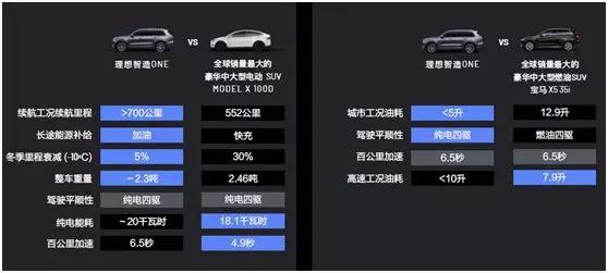 理想智造ONE和特斯拉Model X比,优势在于续航超过700公里,长途能源补给通过加油解决,体验会更好。但百公里电耗相对而言,要高10%。重要的原因在于增程器需要进排气,前面有格栅,影响风阻系数。另外,在加速性能上不如这款网红纯电动SUV,原因在于前面要放增程器,两台电机,一台用户发电,一台用于驱动;后面要布置高压油箱还有后驱电机,空间上不能够支持放功率更高的电机。
