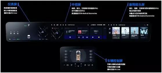 1、四屏交互系统。将车辆功能和娱乐功能做非常好的区分,对用户体验而言,将会避免了特斯拉一个大屏很多常用功能埋的太深,需要10来此点击操作的令人惊叫的痛点。同时,四个不同的屏,用两套系统和两颗芯片支持,能够非常方便地将加以支持。