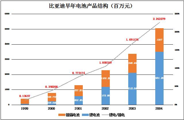 2002年7月,比亚迪在香港主板上市(代码01211.HK),募集资金16亿港元。上市后,锂离子电池出货量把镍镉电池远远抛在后面,1999年锂离子电池销售额仅为镍镉电池的14%,2004年达到226%。