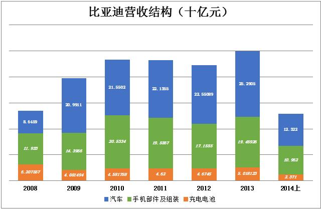 2009年开始,比亚迪业绩结构趋于稳定,汽车、手机、电池座次排定,甚至各部分营收都几乎没有变化。