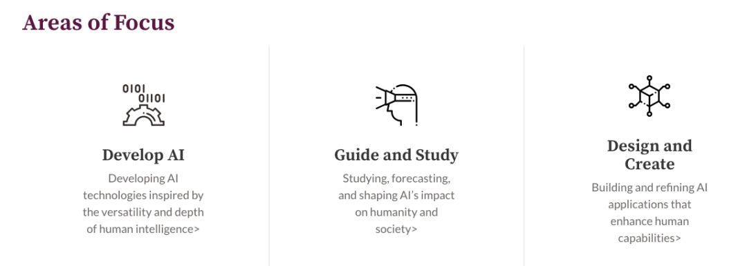 HAI 官网(地址:http://hai.stanford.edu/)显示其工作重点是:开发 AI 技术、指导和研究、设计与创造。