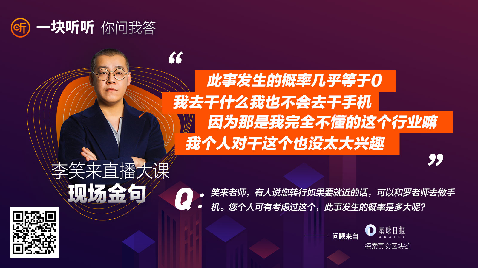 此前李笑来曾在社交媒体上表示个人将不再进行区块链投资。李笑来在会上进一步解释说“我说个人不再投资了,是为了防止各种被站台,说句实话我被站台已经被站烦了。”