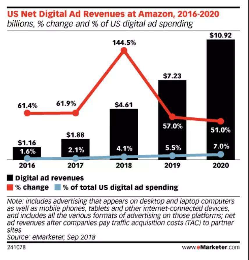 eMarketer预估,到2018年,美国广告商可能会在亚马逊的广告平台上花费46.1亿美元,这一数字比去年增长了144.5%。这家研究公司表示,虽然亚马逊的广告增长部分是由于账单核算上的改变,但主要的原因是企业越来越多地在亚马逊上购买广告。