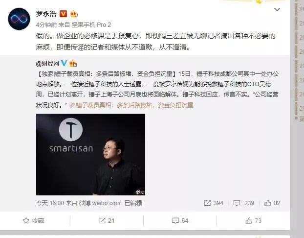 图:罗永浩微博回应公司成都总部解散事件