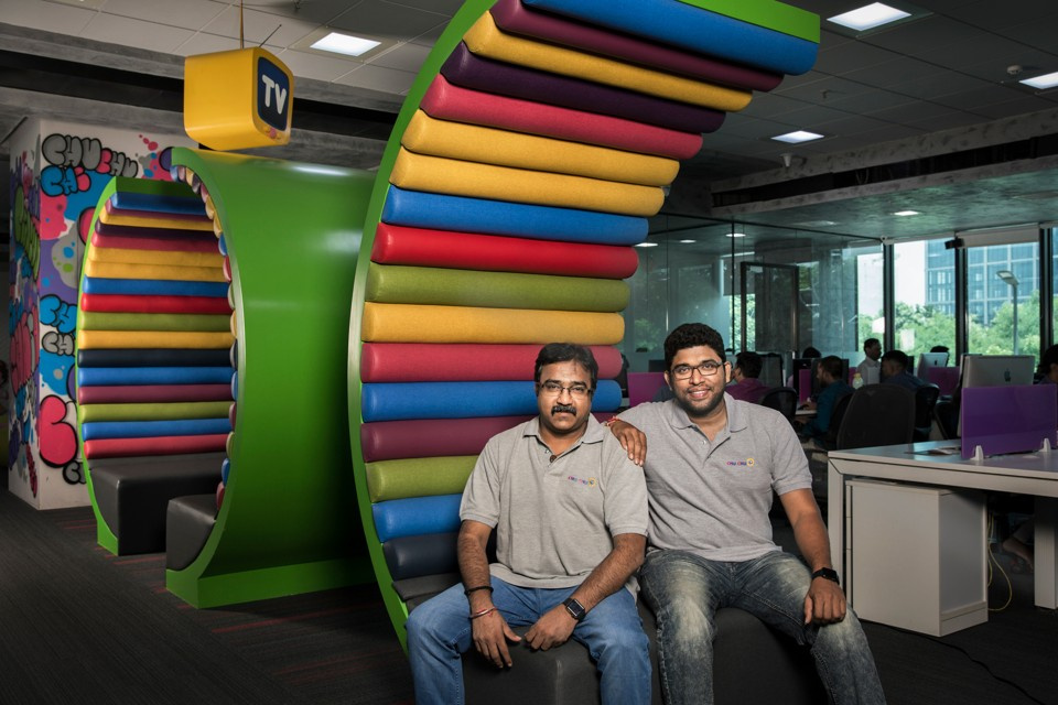 Vinoth Chandar(右)开始为他的女儿创作动画视频,然后决定把它们分享给全世界。他继续跟朋友B. M. Krishnan(左)及其他3人成立了ChuChu TV。