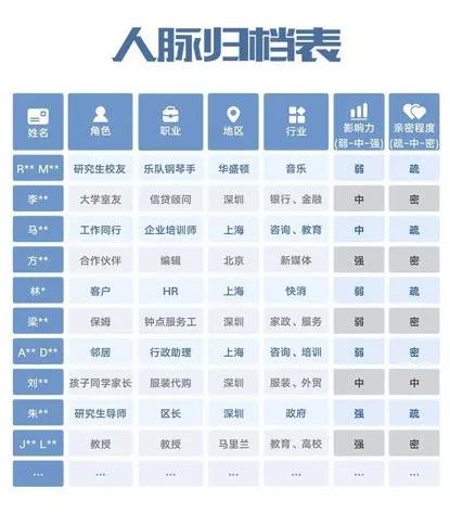如果你属于销售或管理型人才,你清理人脉的原则是不要删掉任何一个可以促成合作的人,那么应该做“分类归档”,你没有选择,各个层面的关系都要维护好。阿里巴巴曾有一位很有名的培训师,教会很多人构建“人脉归档表”,下面有一个样本:
