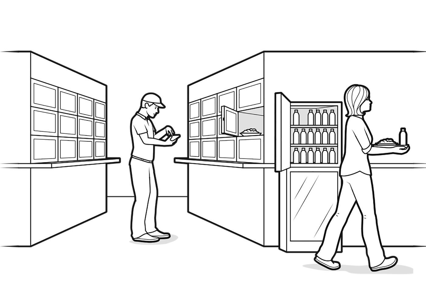 饮料是由看起来像冰箱的智能自动售货机提供的,通过手机扫描门上的二维码就可以解锁。顾客再次关门后,应用程序会通过读取附在瓶子上的射频识别(RFID)标签,自动扣除饮料费用。不过这个系统并非万无一失,有时候也会出现一些问题。