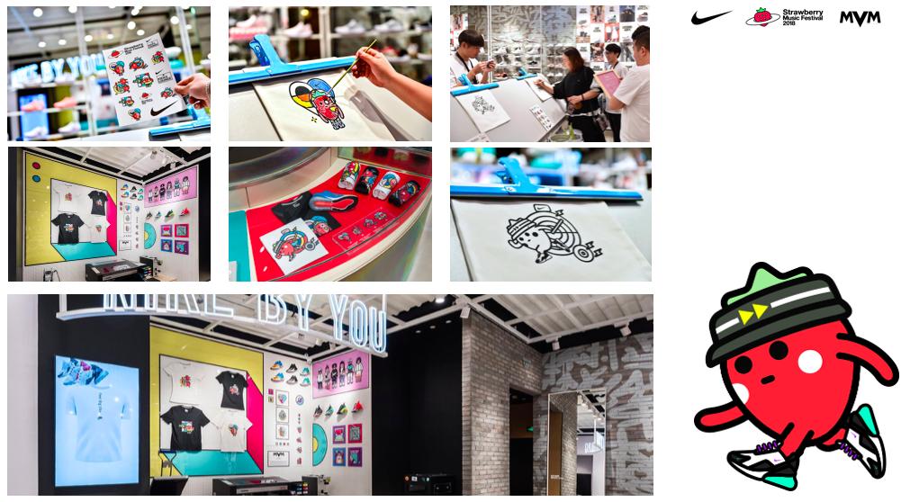 以 2018 年和 Nike 的合作为例,在北京草莓音乐节期间,MVM 为其定制的「爱运动的音乐草莓君」形象推出了限定定制系列。消费者可以在 Nike 门店完成该系列图案的创作,定制系统可以即时输出定制服装及周边。