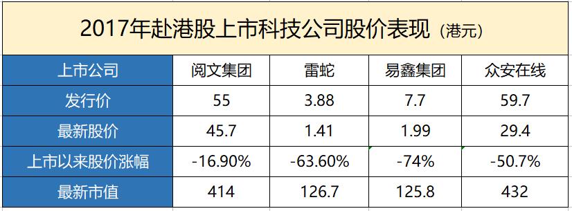 除了小米和美团,今年7月在港股上市的映客目前股价较发行价大跌超35%,去年登陆港股的阅文集团、易鑫集团、众安在线、雷蛇等科技公司最新股价较发行价也出现大幅下滑。