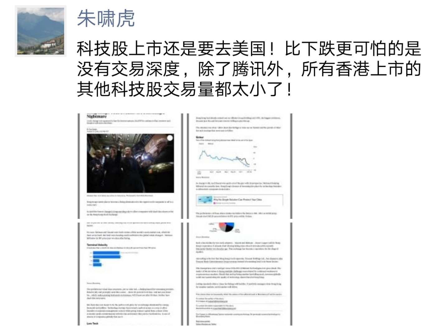 彭博专栏作家Tim Culpan近日撰文指出,港股市场靠改变制度吸引科技公司上市的计划即将事与愿违,随着证券投资经理从香港转向更稳健的市场,科技公司创始人也会跟随。国内著名风险投资人、金沙江创投基金合伙人朱啸虎今日评论该文章称,“科技股上市还是要去美国!比下跌更可怕的是没有交易深度,除了腾讯外,所有香港上市的其他科技股交易量都太小了!”