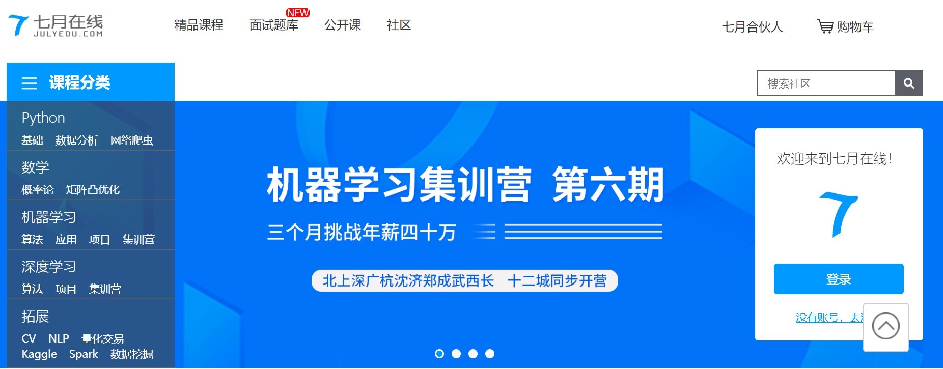 七月在线成立于2015年,是一家专注于人工智能领域的职业教育公司,主要课程包括机器学习、深度学习、Python、数学等内容。以 2010 年开始个人运作的IT博客为基础,经历高校讲座和线下小范围培训试点的业务尝试,七月在线最终确立了在线教育的模式。目前,平台上提供在线直播大班、在线小班、在线一对一和线上线下结合的集训营等多种班型课程选择,定价从百元至万元不等。