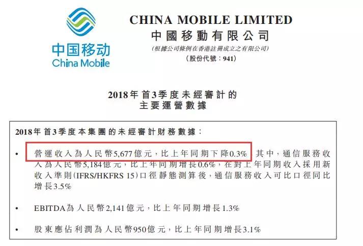10月22日晚间,中国移动(00941,HK)在港交所发布前三季财报。数据显示,中国移动2018年前9个月,营运收入为人民币5677亿元,比上年同期下降0.3%,净利润为人民币950亿元,比上年同期增长3.1%。值得注意的是,这是中国移动2014年以来首次出现营收下滑的情况。