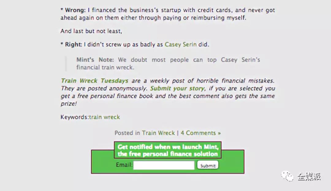在读者初具规模的时候,尽管预算不足,Mint也在不断尝试新的营销策略。他们邀请其他的理财博主前来做客,进行问答,并将这些博主的回复也作为内容营销的一部分,在博客上突出显示。不仅如此,在每篇推送的末尾,他们还加上了一个电子邮箱地址收集,请想要收到APP上线通知的用户留下邮箱。9个月之后,尽管Mint还没有上线,但他们已经收集了两万个用户邮箱。