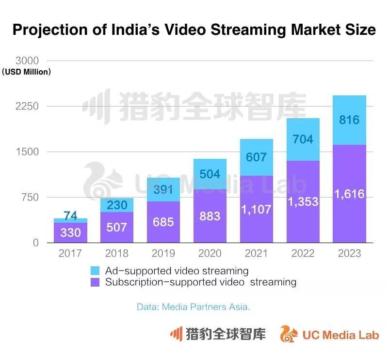 而除了YouTube这种视频集成平台仍旧占据在线视频消费的大头之外,有自制内容能力的平台如Amazon Prime Video和Netflix也将印度作为他们的重点市场,自2018年以来印度用户体量逐渐扩大。