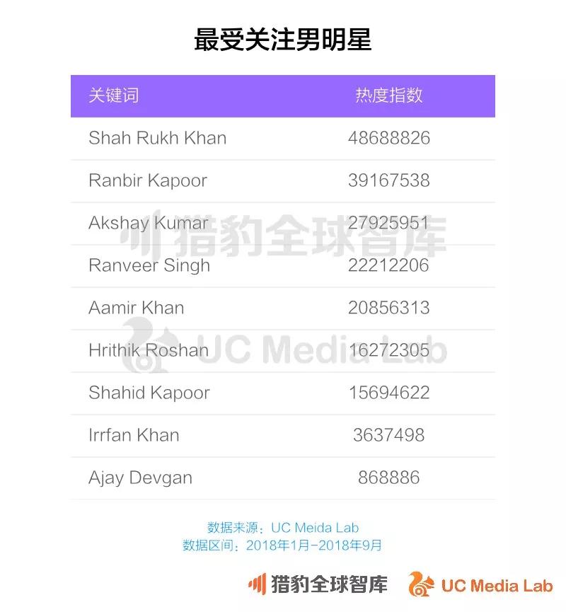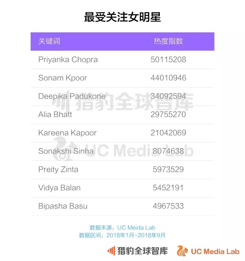 根据UC国际信息流提供的消费数据,中国人最为熟知的印度男明星阿米尔汗在热度榜上仅名列第5,今年排名第一的男明星是另一位老戏骨沙鲁克汗。女明星热度榜上排名第一的是刚刚订婚Priyanka chopra。