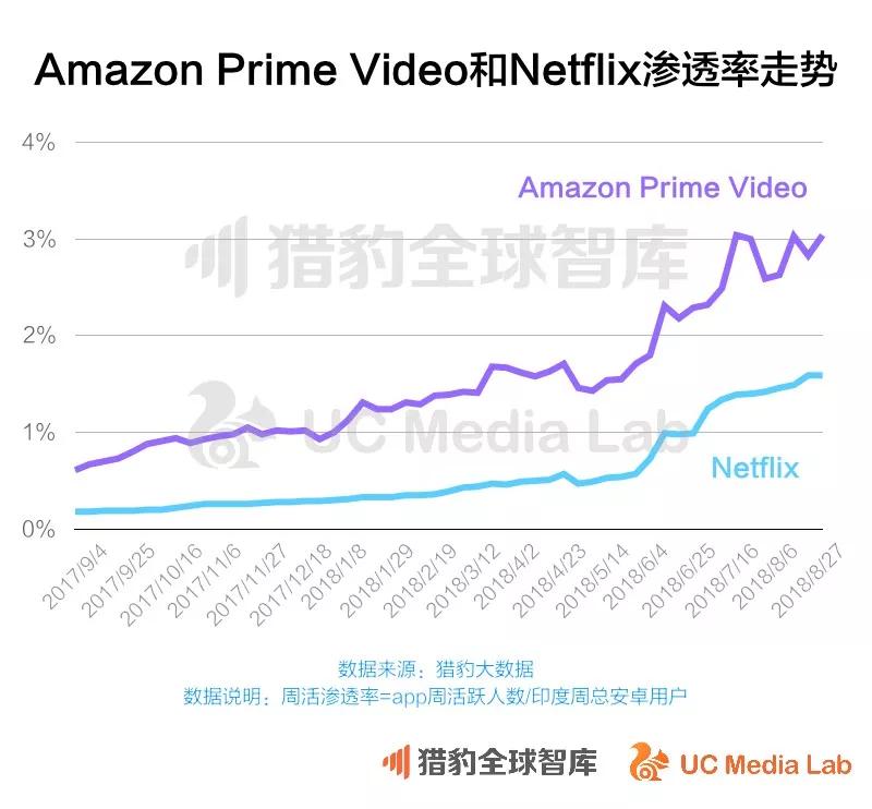 猎豹大数据显示,从2017年9月到2018年9月,Amazon Prime Video和Netflix在用户周活跃渗透率上均有大幅的上升,Amazon Prime Video上涨了3倍,而Netflix上涨了6.8倍。