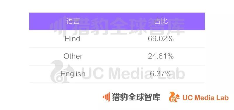关注娱乐行业的用户,语言主要是hindi语,占69.2%;英语仅占比6.37%;其余24.61%为其它小语种用户。