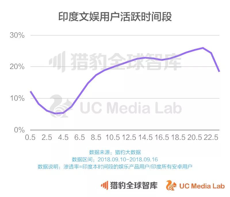 从猎豹大数据可以看出,晚上6点到10点是印度文娱用户的使用高峰。