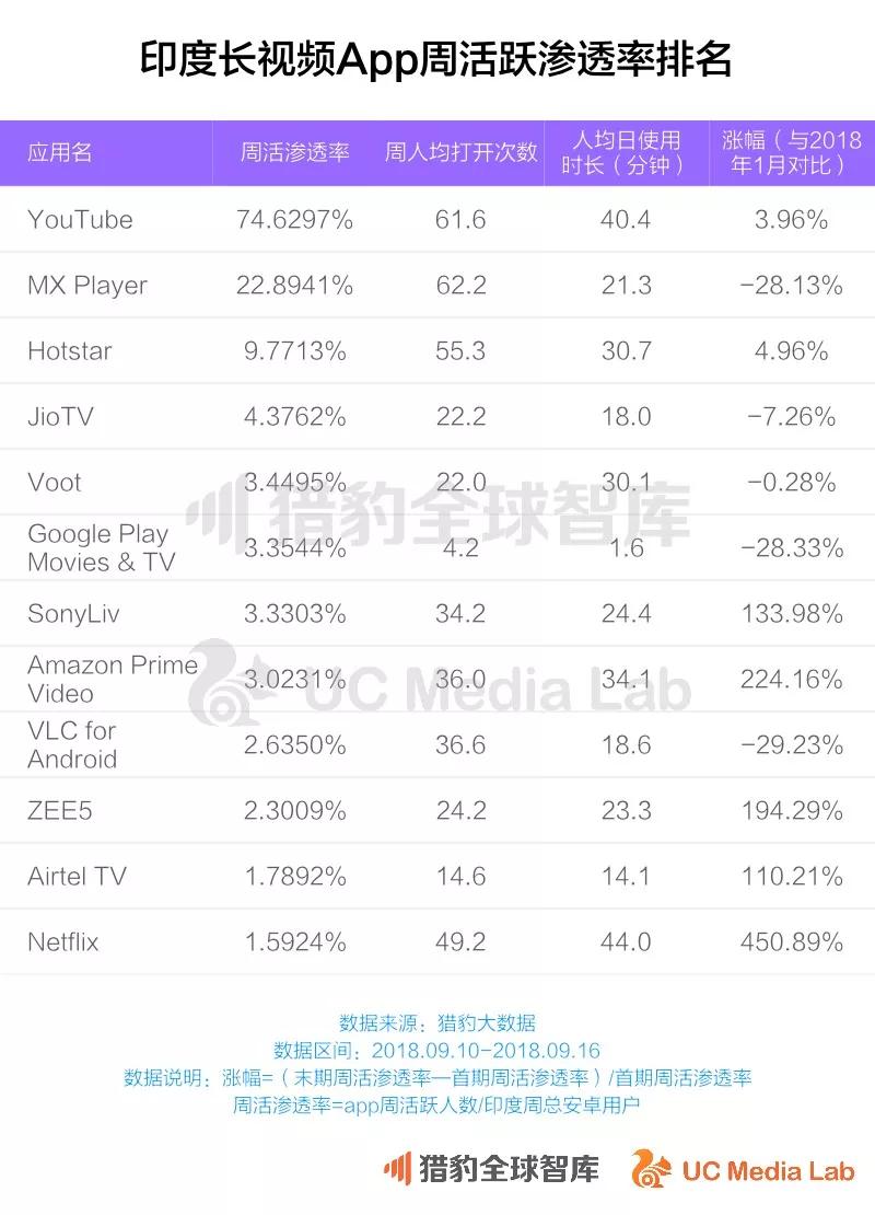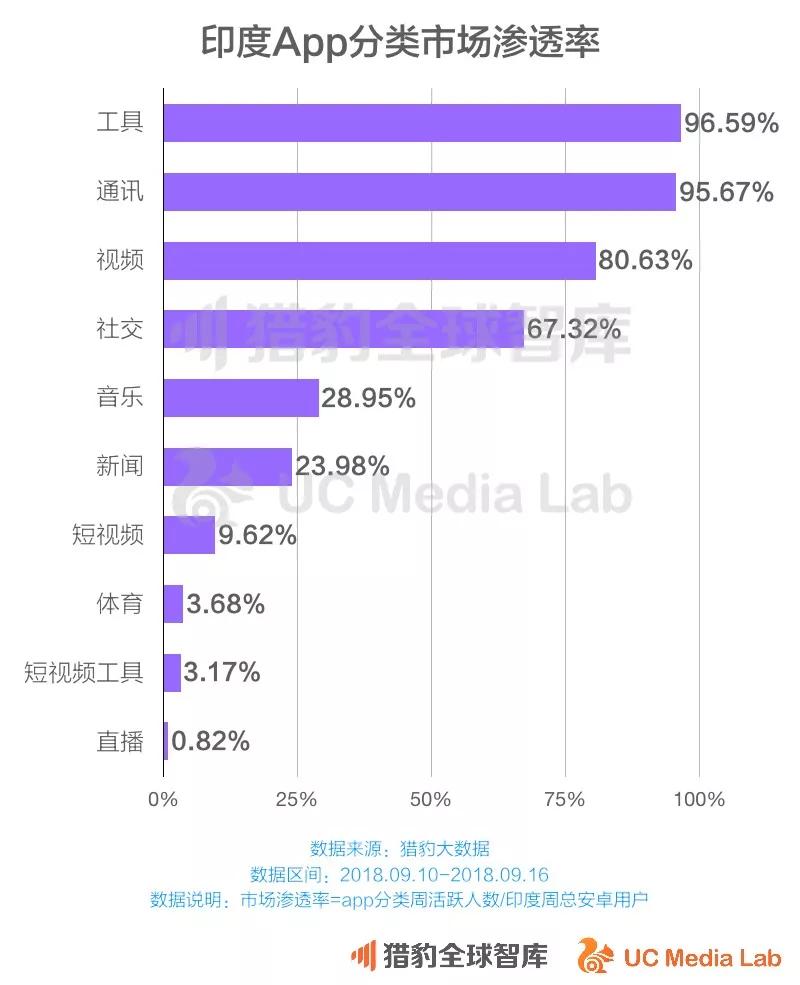 据猎豹大数据,印度智能手机用户平均每人每天在线娱乐时间为1.1小时;在印度app各分类中,视频类app的活跃渗透率仅次于工具和通讯分类,排名第三,高于社交分类。相对来说,印度用户比中国和美国的用户更喜欢消费在线娱乐产品。