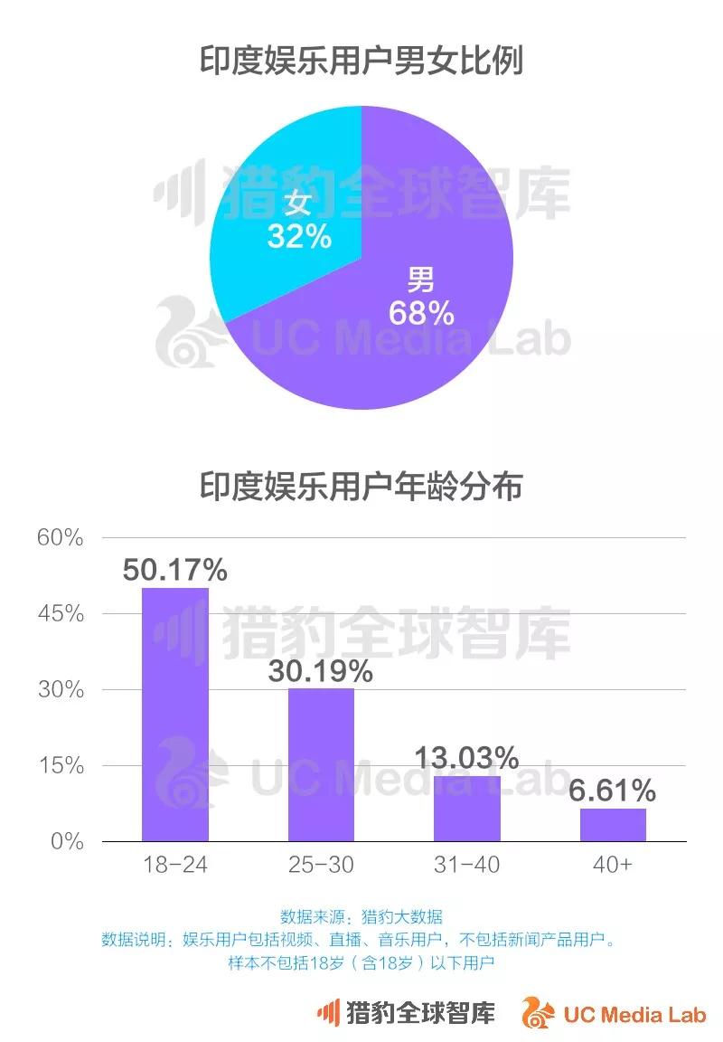 猎豹大数据显示,印度娱乐用户的性别比例与印度网民性别比例一致,男性占绝大部分,比例为67.89%。而且在所有文娱用户中有80.36%是30岁以下的年轻人。