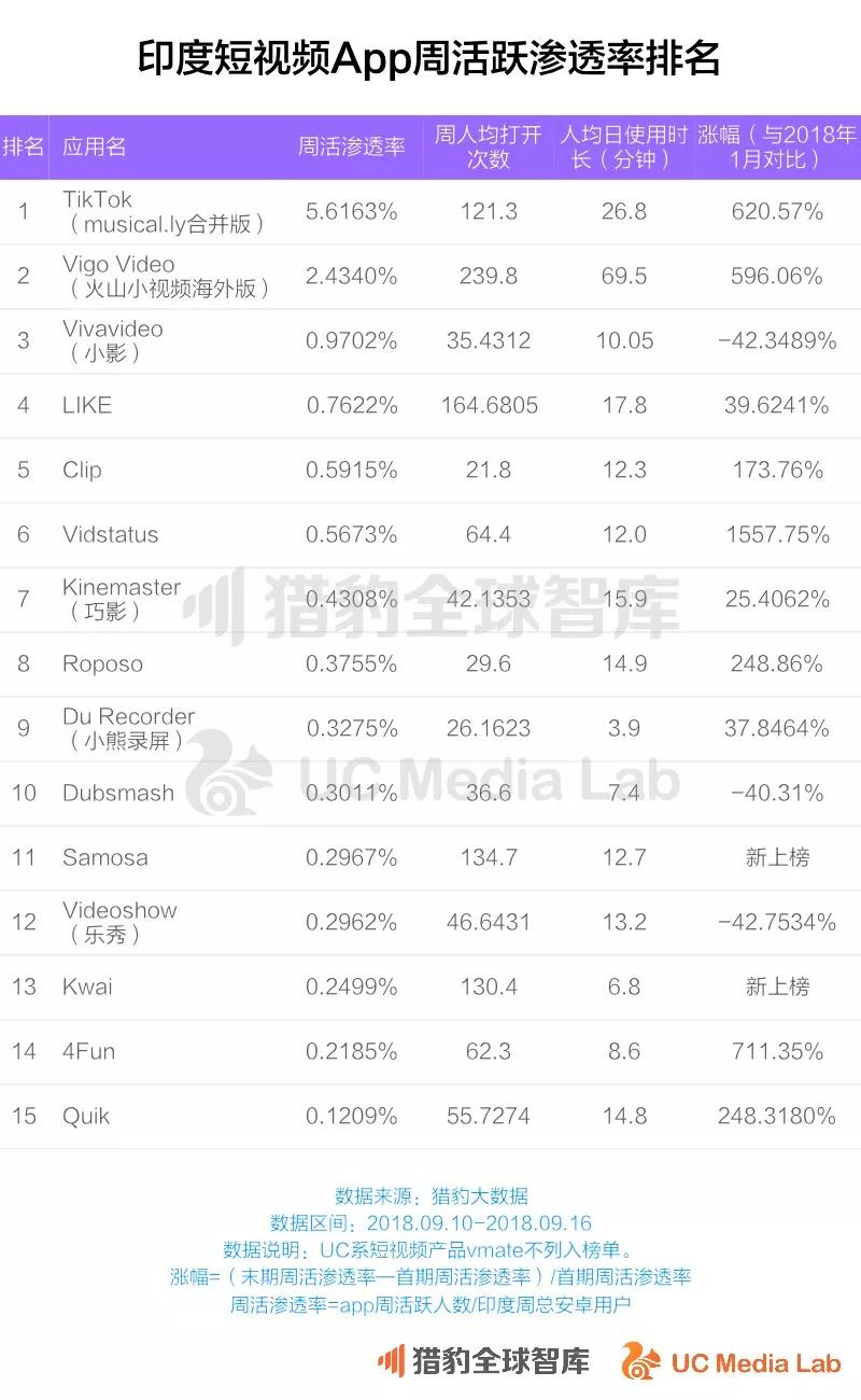 2018年是印度短视频产品大量出现并且蓬勃发展的一年,根据猎豹大数据,去年在印度具有一定规模的短视频app仅有5款,而今年市场渗透率在0.1%以上的就有17款,而在这些app发行商中,又有大部分来自中国。前四名TikTok,Vigo,Vivavideo,LIKE都是中国发行商,而第五名Clip得到了来自中国的顺为资本的投资,其它像快手和UC的vmate在印度都发展得不错。