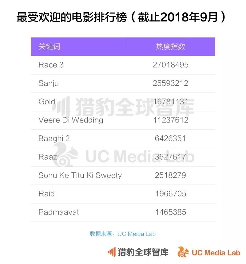 根据UC国际信息流的消费数据,今年6月上映的电影Race 3成为到现在为止印度热度最高的电影,从这个排行榜看,所有热门电影都是宝莱坞生产的印度本土电影,说明贴近本地文化的内容在印度人心中仍占有先发优势。
