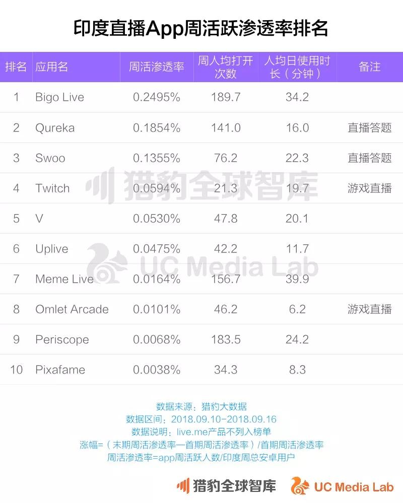 与中国的情况不同,直播在印度一直不温不火,没有爆发。与其他在线娱乐形式相比,在线直播app的用户也很少。在东南亚大火的中国直播平台Bigo Live仍然在分类榜单上排名前列(Iive.me产品未列入榜单)。但有意思的是,2018年初在中国火爆一时的在线直播答题类娱乐,由于政策的管制和资本的撤出已经销声匿迹,但在印度仍旧受到欢迎,榜单上第二Qureka和第三名的Swoo都是属于这个类型的产品。