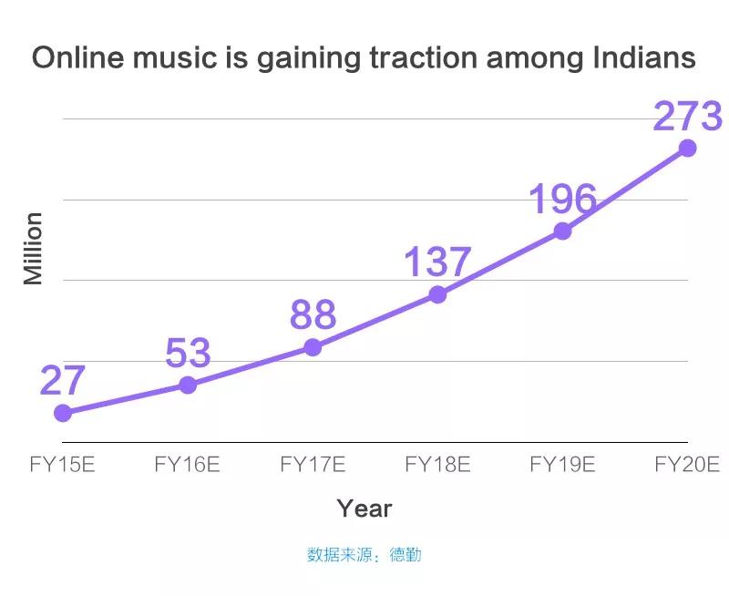 根据IFPI的报告, 2017年印度的音乐产业收入出现了6年以来的最快增长,其中音乐流媒体的收入增长率为37.26%,现在数字音乐的收入占印度音乐行业收入的91%以上。根据德勤公司的预测,2018年印度的在线音乐用户有1.37亿,并且到2020年达到2.73亿。