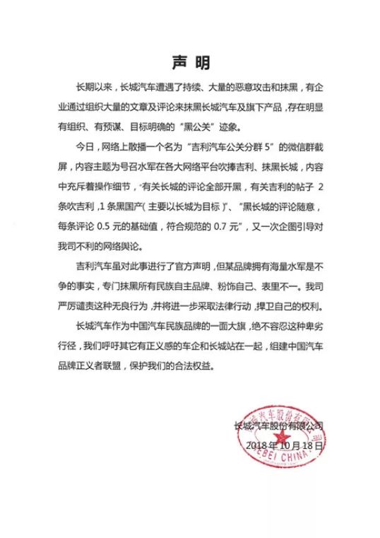 同时声明中还表示,将呼吁其他有正义感的车企和长城站在一起,组建中国汽车品牌正义者联盟,保护合法权益。