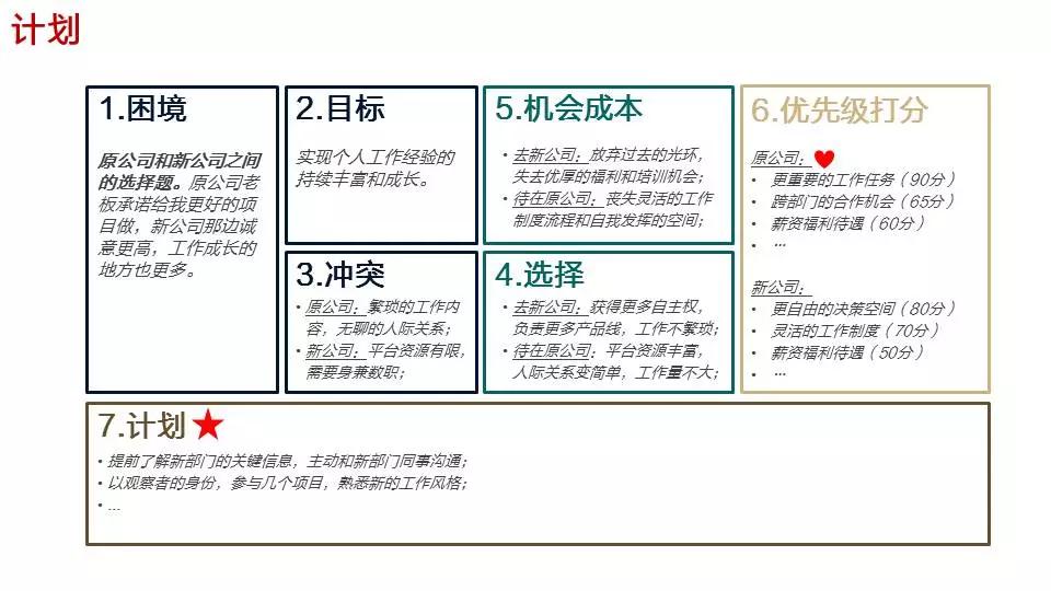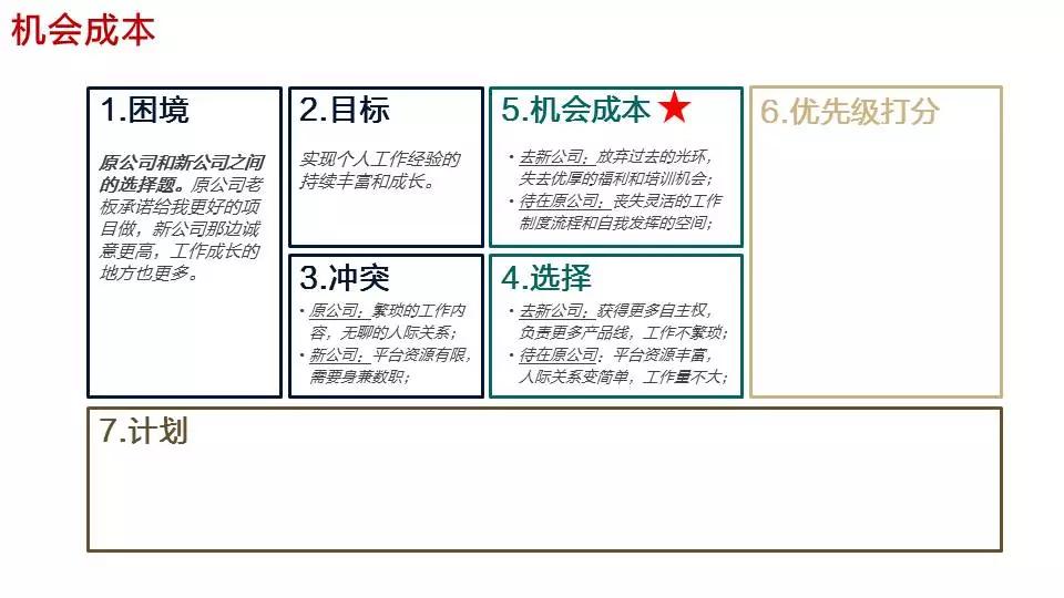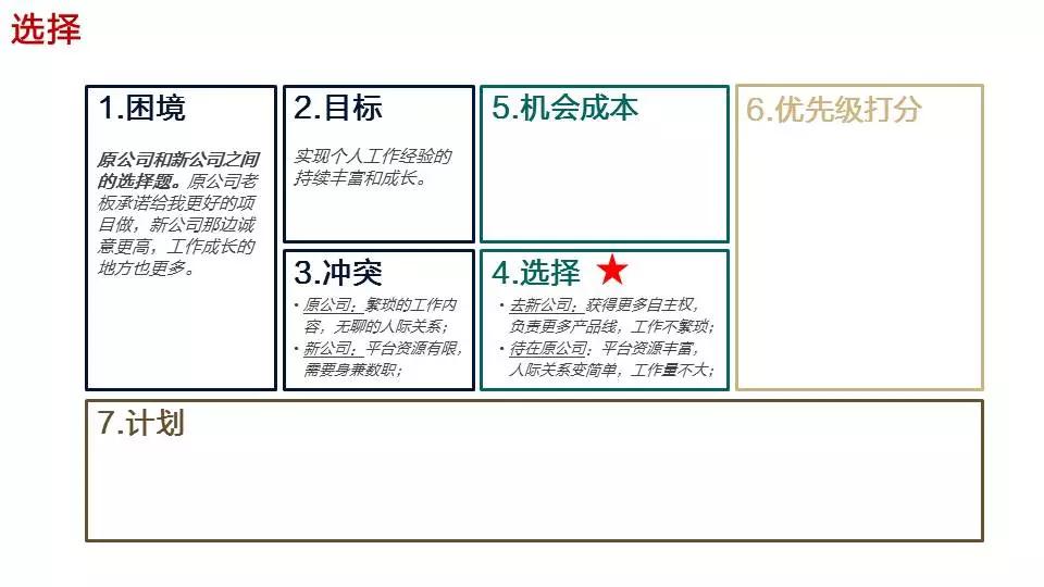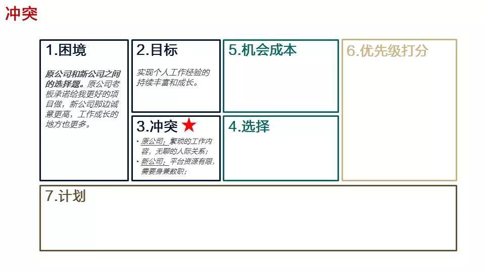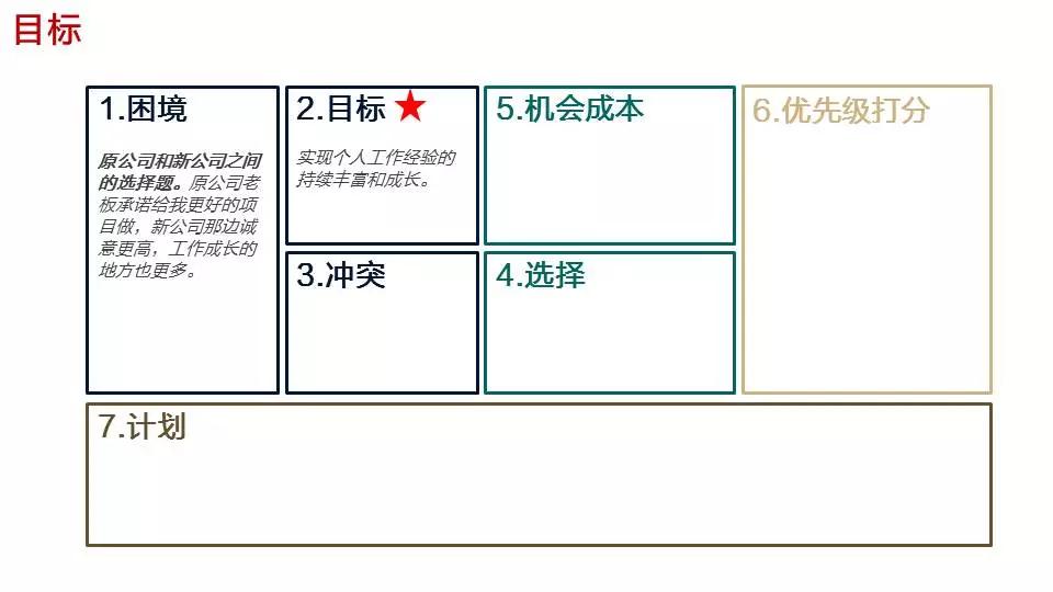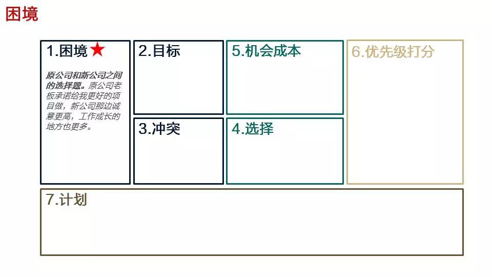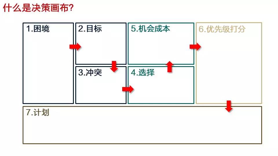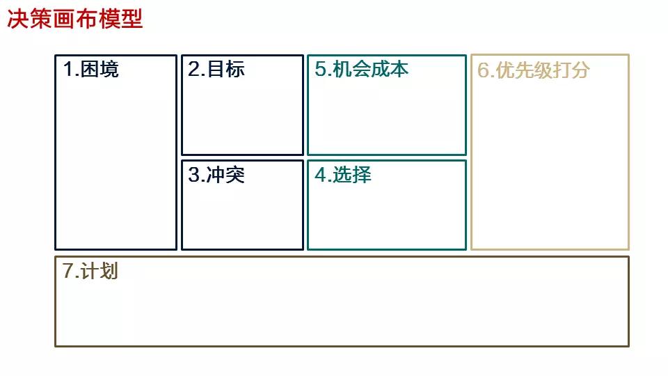 决策画布一共分为7个板块。分别是:困境,目标,冲突,选择,机会成本,优先级打分,计划。