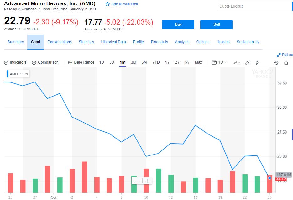 盘后跌超20%,AMD三季度收入下滑,业绩指引意外逊于预期