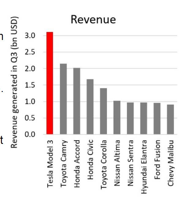 由于Model 3相比其他中低端车更高的价格定位,使得尽管其销量逊于本田、丰田等主流车型,但销售额却高居第一位,仅Model 3这一款车型在第三季度就给特斯拉带来了超过30亿美元的收入,远超第二位车型丰田凯美瑞在该季度中获得的超过20亿美元收入。