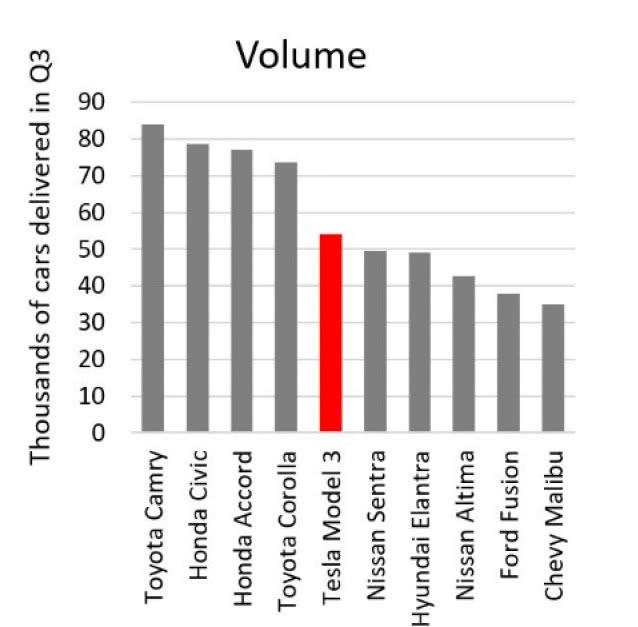 这样的定位有着实际数据支撑,在第三季度中,Model 3总共售出了56000辆,已经跻身美国中低端乘用车销售量的第五位,排在Model 3之前的是传统意义上的畅销车,例如丰田凯美瑞、本田雅阁、本田思域、丰田卡罗拉等,Model 3在该季度已经击败了尼桑Altima、福特Fusion、雪佛兰Malibu等中低端市场的畅销车型,从某种意义上来看,特斯拉正在通过Model 3这款车型颠覆美国中低端乘用车市场。