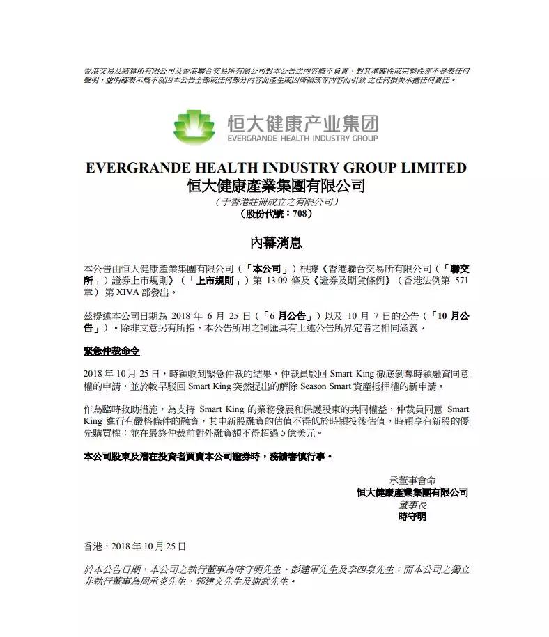 据恒大健康公告披露,香港国际仲裁中心下达的紧急救助令显示,驳回FF要求彻底剥夺恒大融资权的诉求,驳回FF提出的解除Season Smart资产抵押权的申请。鉴于FF在目前的资金状况下濒临破产,为了保护恒大等所有股东的共同利益,允许FF进行有严格条件的融资,其中新股融资的估值不得低于恒大投后估值,恒大享有新股的优先购买权,FF在最终仲裁前对外融资额不得超过5亿美元。