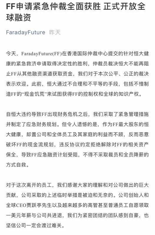 FF随即公告宣称获得“决定性胜利”,“仲裁员裁决恒大不能再阻止FF从其他融资渠道获取资金……正在寻求与我们愿景和价值观相同的全球投资人合作”。