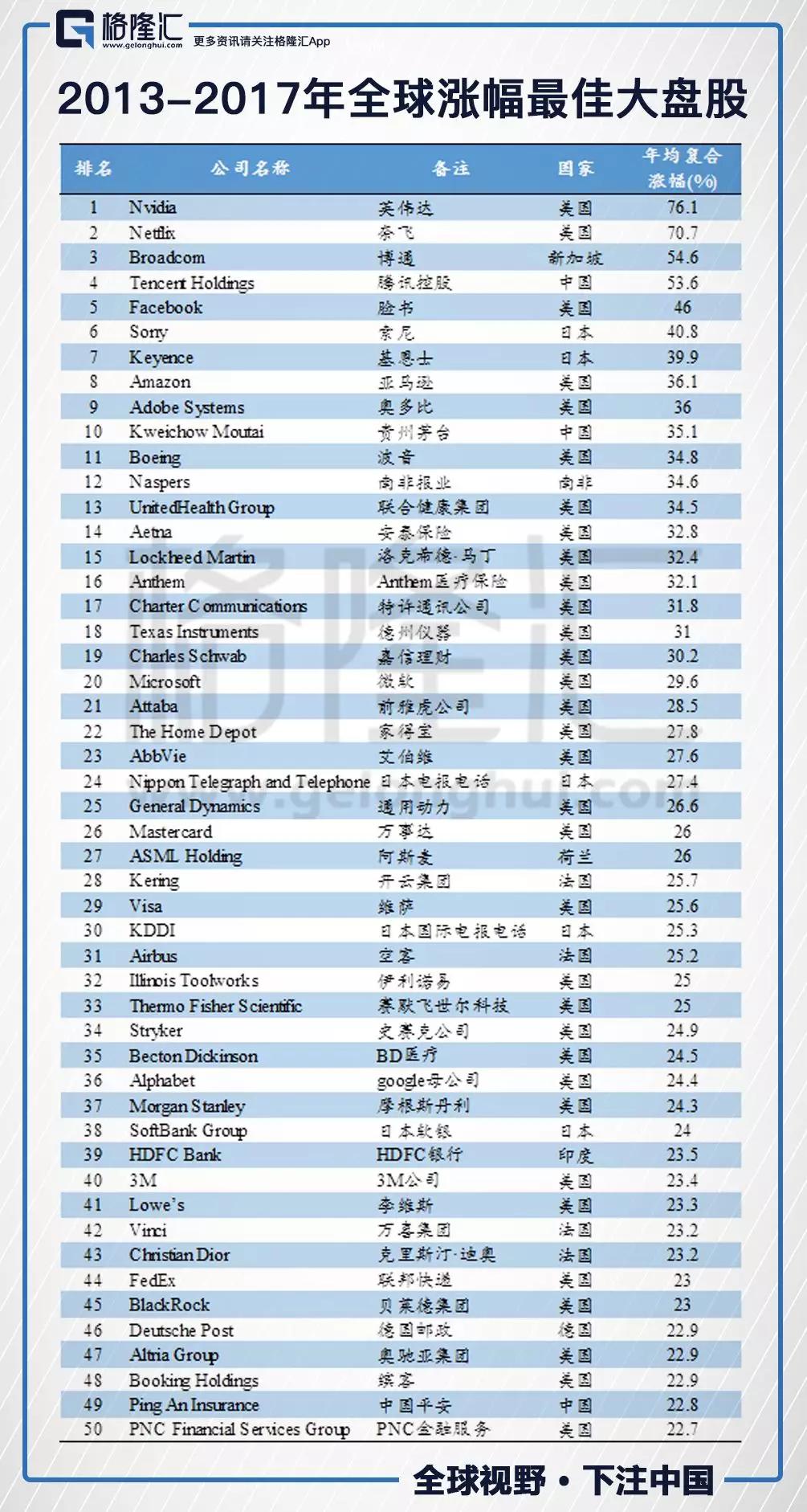BCG咨询之前出了一份2013-2017年全世界的大市值公司的涨幅排行榜,名单中美国有33家公司上榜,其中科技公司占大部分,其他的多是医疗、金融、消费。