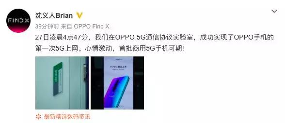 10月26日,一加CEO刘作虎基于实验室环境下的5G网络,发出世界上第一条5G推特。他在推特上写道:“向5G问好!”,并附带图片描述了一加5G项目中一系列重要里程碑。随后,刘作虎转发了这条推特,并补充道:“这是世界上第一条5G推特。”本月23日,一加称预计在2019年率先发布5G可商用手机。26日早些时候,OPPO也成功实现了在OPPO手机上的5G上网。(界面)