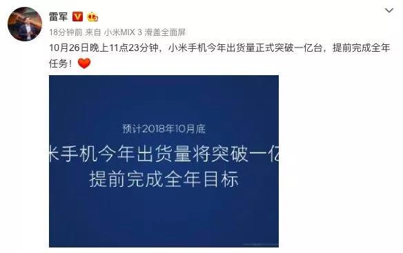 36氪讯,雷军发布微博称,10月26日晚上11点23分钟,小米手机今年出货量正式突破一亿台,提前完成全年任务。此前,小米集团发布公告称预期十月底,今年手机出货量将超过一亿台。