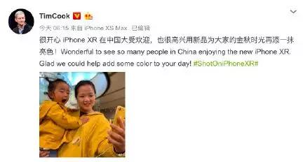36氪讯,10月27日苹果CEO库克在微博发文称很高兴iPhone XR在中国大受欢迎。26日,苹果iPhoneXR在全球各地正式开售,该机是苹果秋季发布会推出的三款新iPhone中最亲民的一款,使用了A12处理器、支持Face ID等。