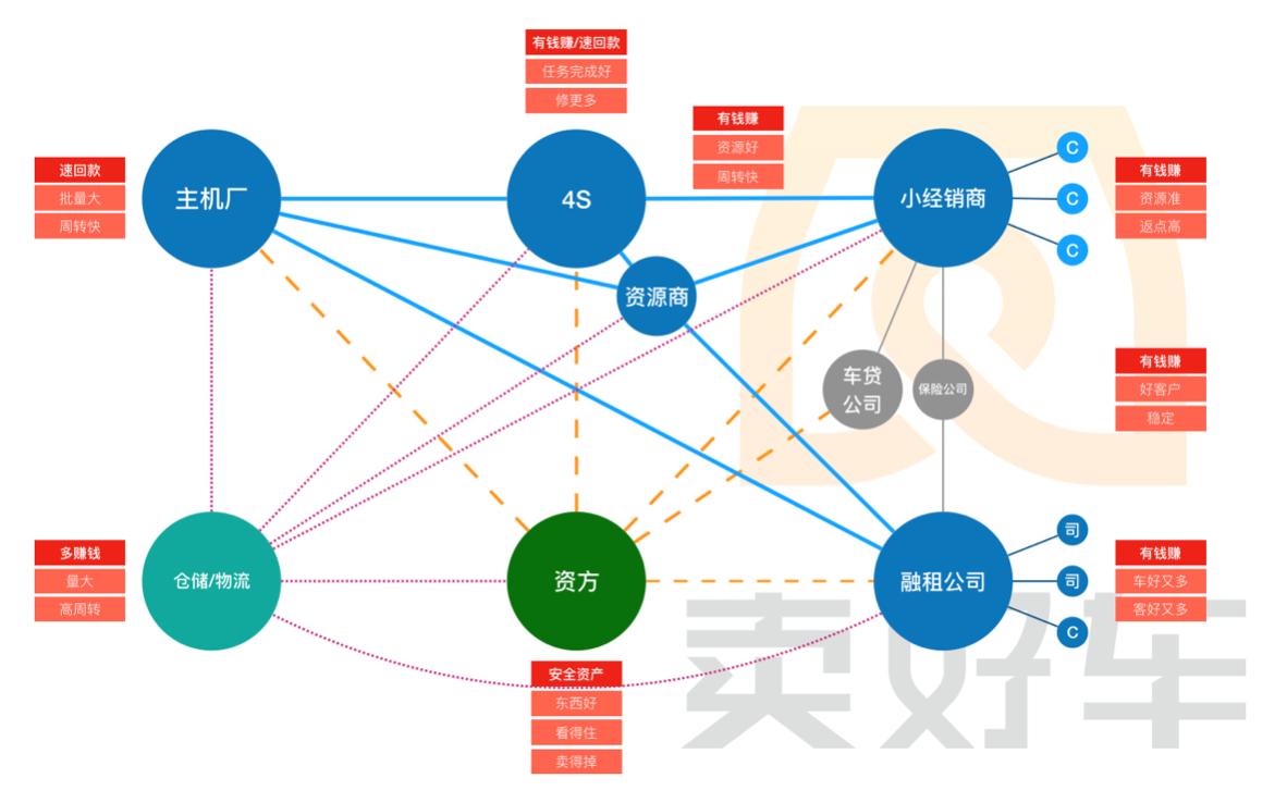 我们来理解一下汽车这个行业,如上图,表明了汽车流通领域的6个主要利益攸关方,我们必须深入理解他们的生意本质,以及他们的需求,这样才能找到基础设施从哪里入手。