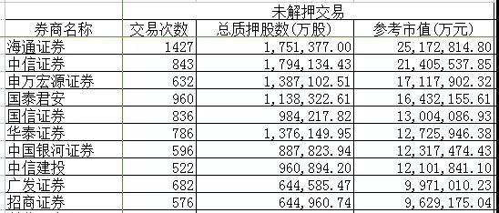 需要注意的是,由于质押率、质押基准价和平仓线等指标各家公司都不相同,因此未解押交易的参考市值并不等于(远远大于)券商提供(自营加上资管计划产品)的融资金额,仅作为参考。