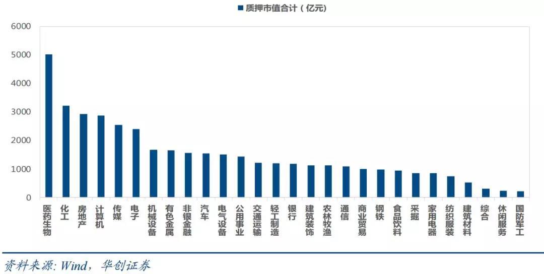 依据行业不同,根据华创证券统计,截至2018年10月24日,全市场质押市值最高的行业为医药生物,总计近5000亿元;化工排名第二,超过3000亿元;房地产第三,略低于化工。