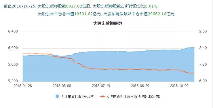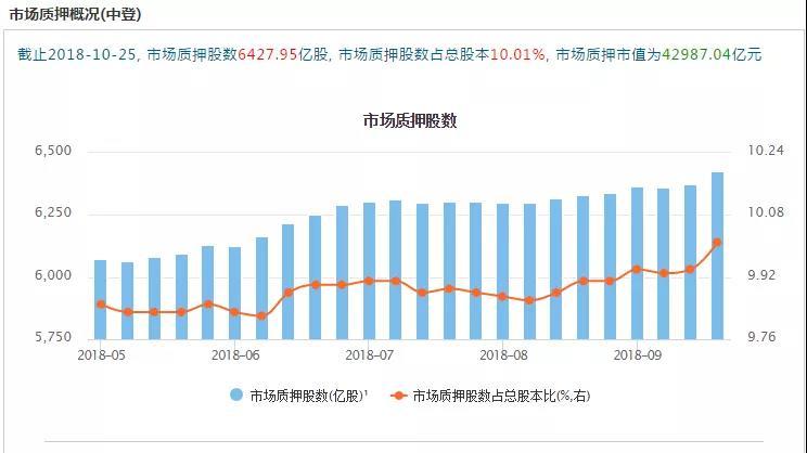 中登公司数据显示,2018年5月以来,全市场的质押股数(场内加上场外)占总股本比例一直上升,不算上每周发行新股带来总股本的扩张,这意味着分母一直变大,但分子的增大速率更快,截止10月25日,该比例突破10%。