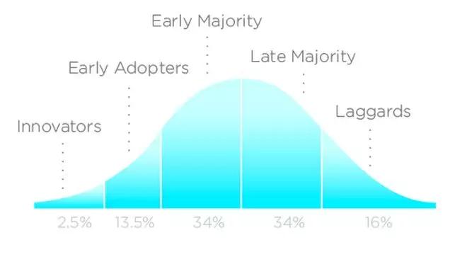 Everett Rogers曾在他的经典著作《Diffusion of Innovations》一书中阐述道,这种问题的分布规律通常遵循钟形曲线。也就是说,我们一般认为80、90后是属于最早的接纳新技术的一批,而60、70更多属于落伍的那一批。