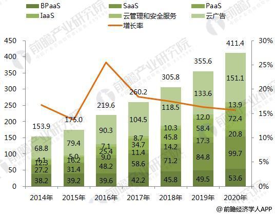 2014年-2020年全球云服务市场规模及预测(单位:亿美元 %)