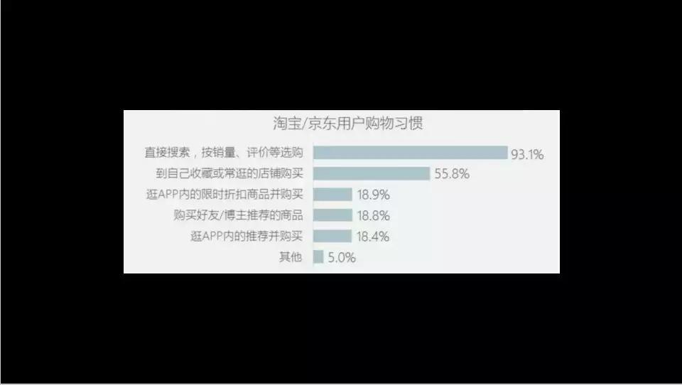 APP里第一类是秒杀、特杀、清仓、免单,只有44%是搜索。而淘宝和京东的购物习惯93%是搜索。