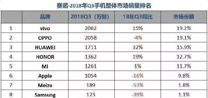 不能否认,华为曾把小米当做良师益友,效仿其互联网手机模式。2013年,华为旗下子品牌荣耀正式独立出去,欲与当时一批互联网手机品牌拼个高下。如今,青出于蓝而胜于蓝。赛诺发布的2018年Q3手机市场数据显示,荣耀手机在国内销量排名第四,超出小米101万部。