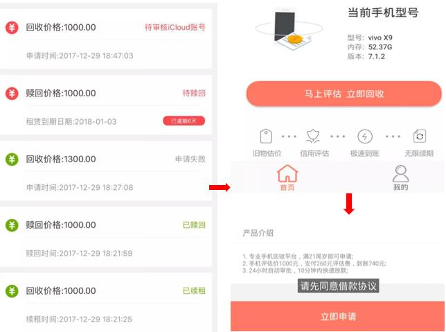 一些现金贷平台的产品,名字里通常都带有“回租”、“回收”、“回购”,比如闪电回购、蚂蚁回租、趣租租等,产品使用流程简单,用户只需几步就可完成。具体来说,用户下载其APP后,系统会自动识别手机型号,然后提醒用户将手机卖给平台;平台会评估手机的回收价格,这个价格并不是手机真实的价值,而是用户要申请的现金贷额度。用户点击申请后,提交身份信息、工作信息、运营商数据等,就可以静待放款了。