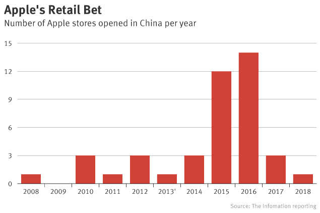 然而,受到消费者欺诈等影响,苹果实现上述目标晚了四年,到2016年才开设了26家零售店。从那以后,苹果对中国的零售计划踩了“刹车”。
