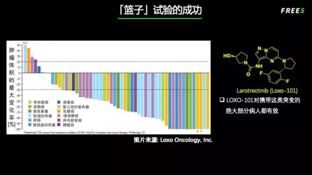 第二个问题,LOXO 公司设计了一种所谓的 “篮子” 试验,就是通过基因测序,把所有肿瘤病人中携带这类突变的病人找出来。不管是胃癌、肺癌、乳腺癌,都放在一起治疗。临床效果非常出色,绝大部分患者的肿瘤都缩小了甚至消失了!LOXO 公司的股票一个月内从 $116 飙到了 $208。